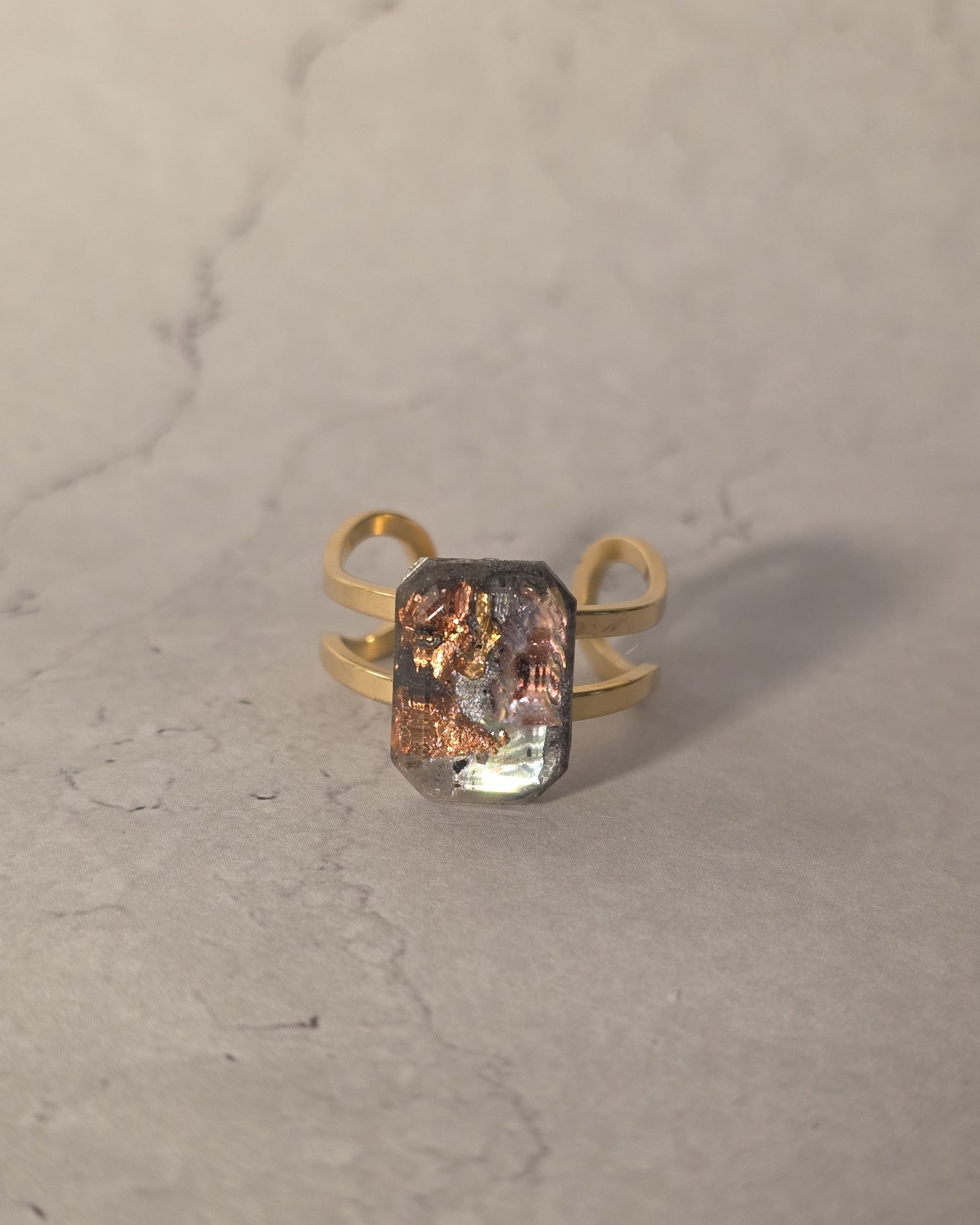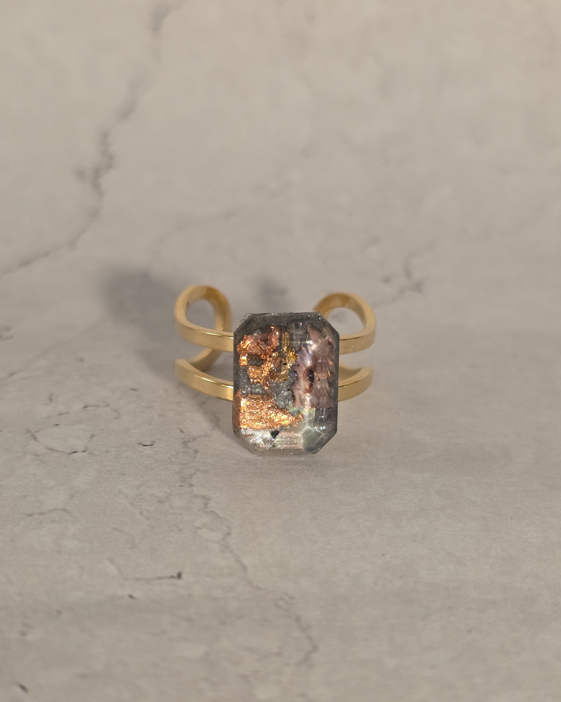 One-of-a-kind handcrafted resin cabochon on gold-plated stainless steel adjustable band. Each ring is individually handmade, ensuring no two are exactly alike. Lightweight, durable, and versatile, perfect for layering or wearing solo.