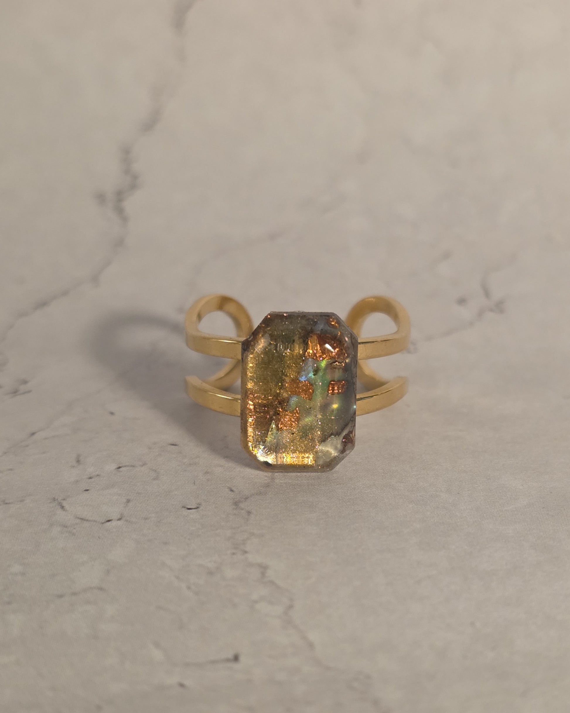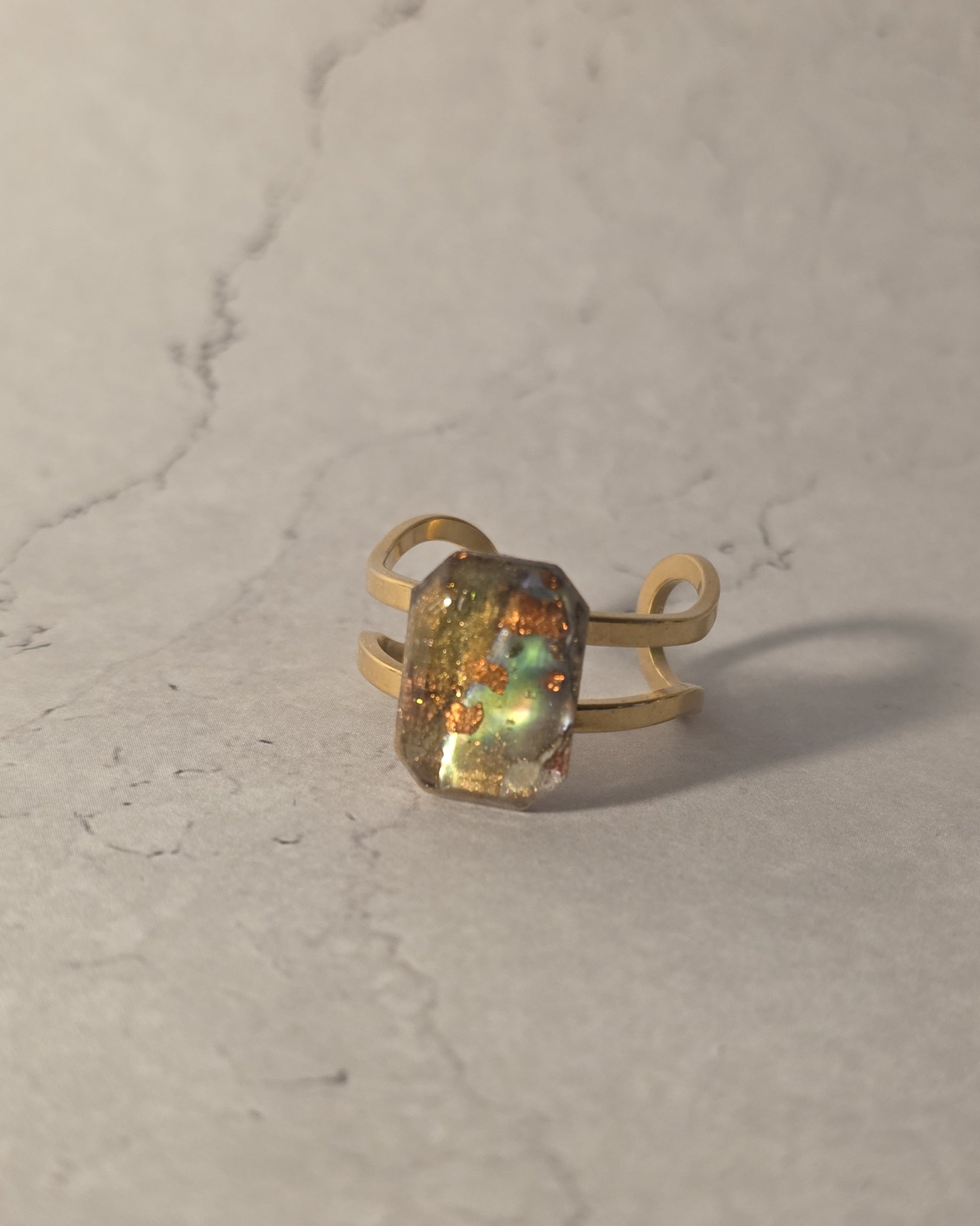 One-of-a-kind handcrafted resin cabochon on gold-plated stainless steel adjustable band. Each ring is individually handmade, ensuring no two are exactly alike. Lightweight, durable, and versatile, perfect for layering or wearing solo.