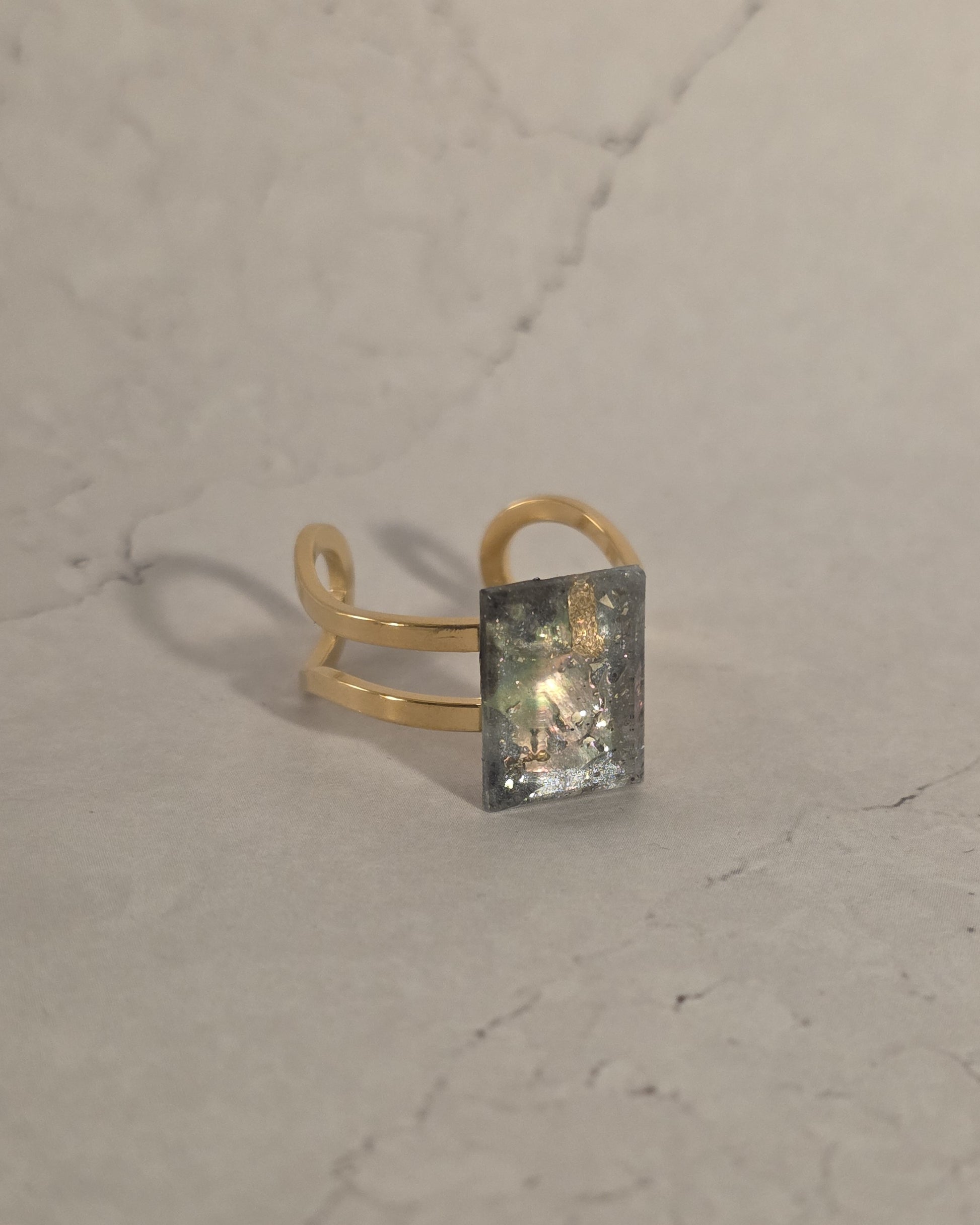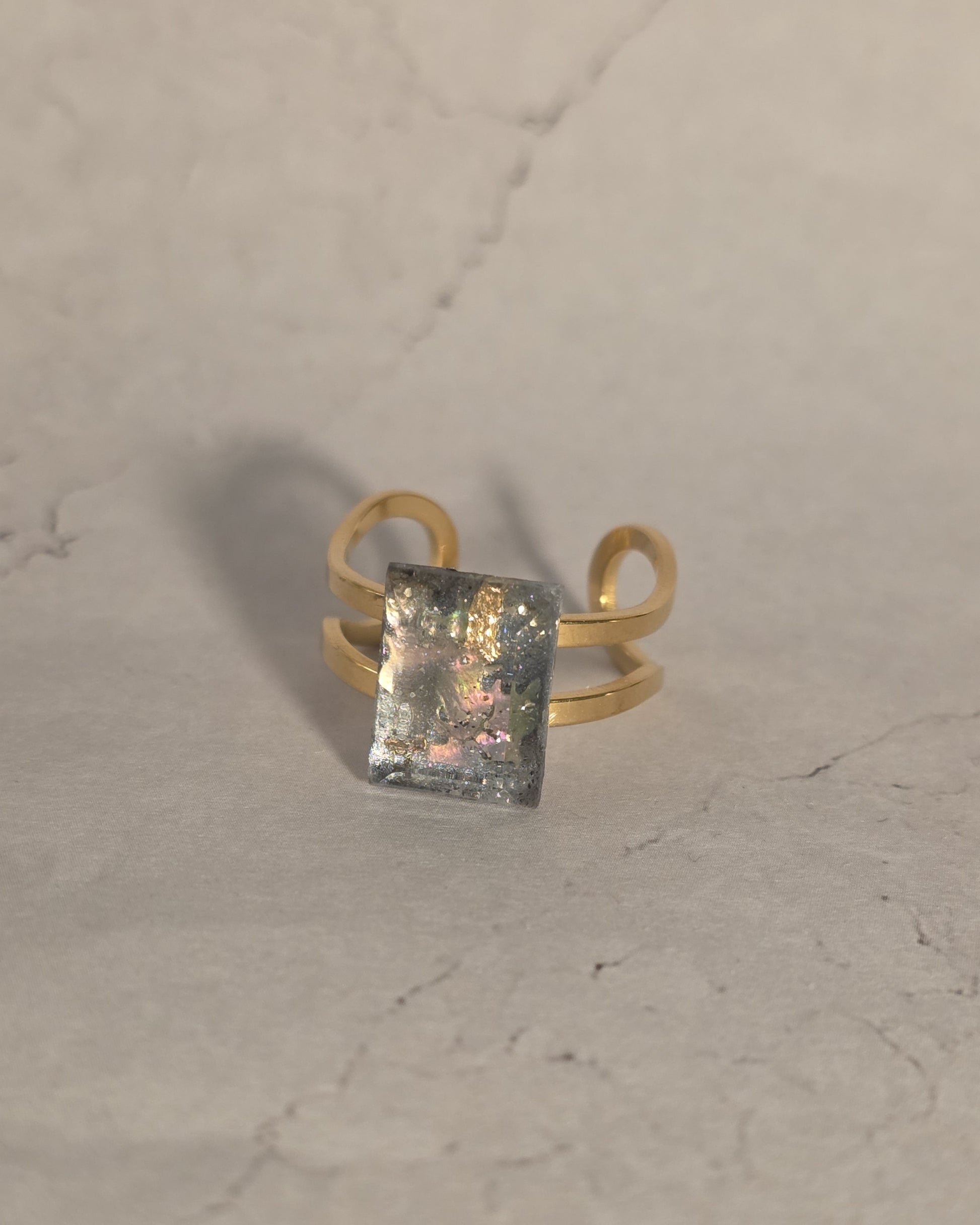One-of-a-kind handcrafted resin charm on gold-plated stainless steel adjustable band. Each ring is individually handmade, ensuring no two are exactly alike. Lightweight, durable, and versatile, perfect for layering or wearing solo.