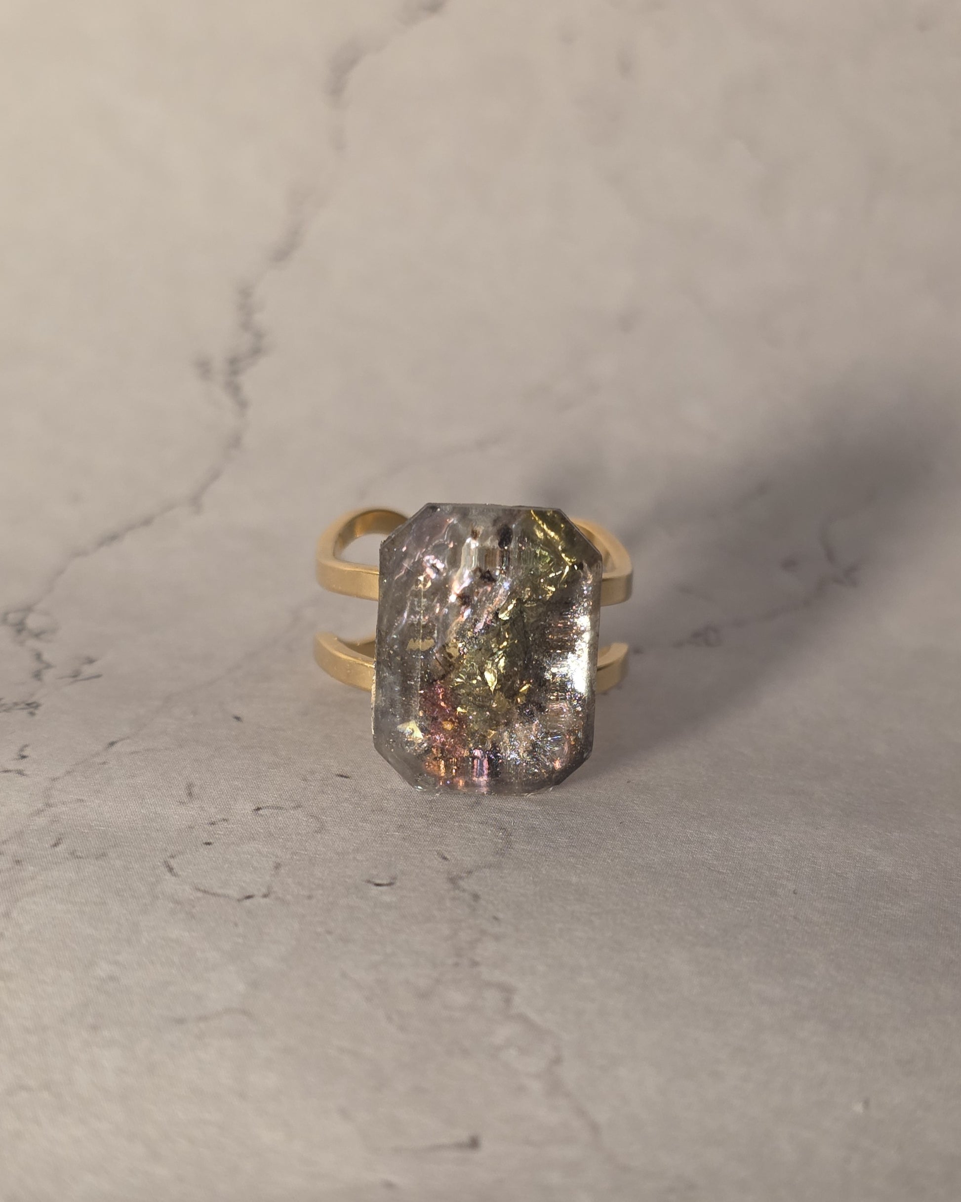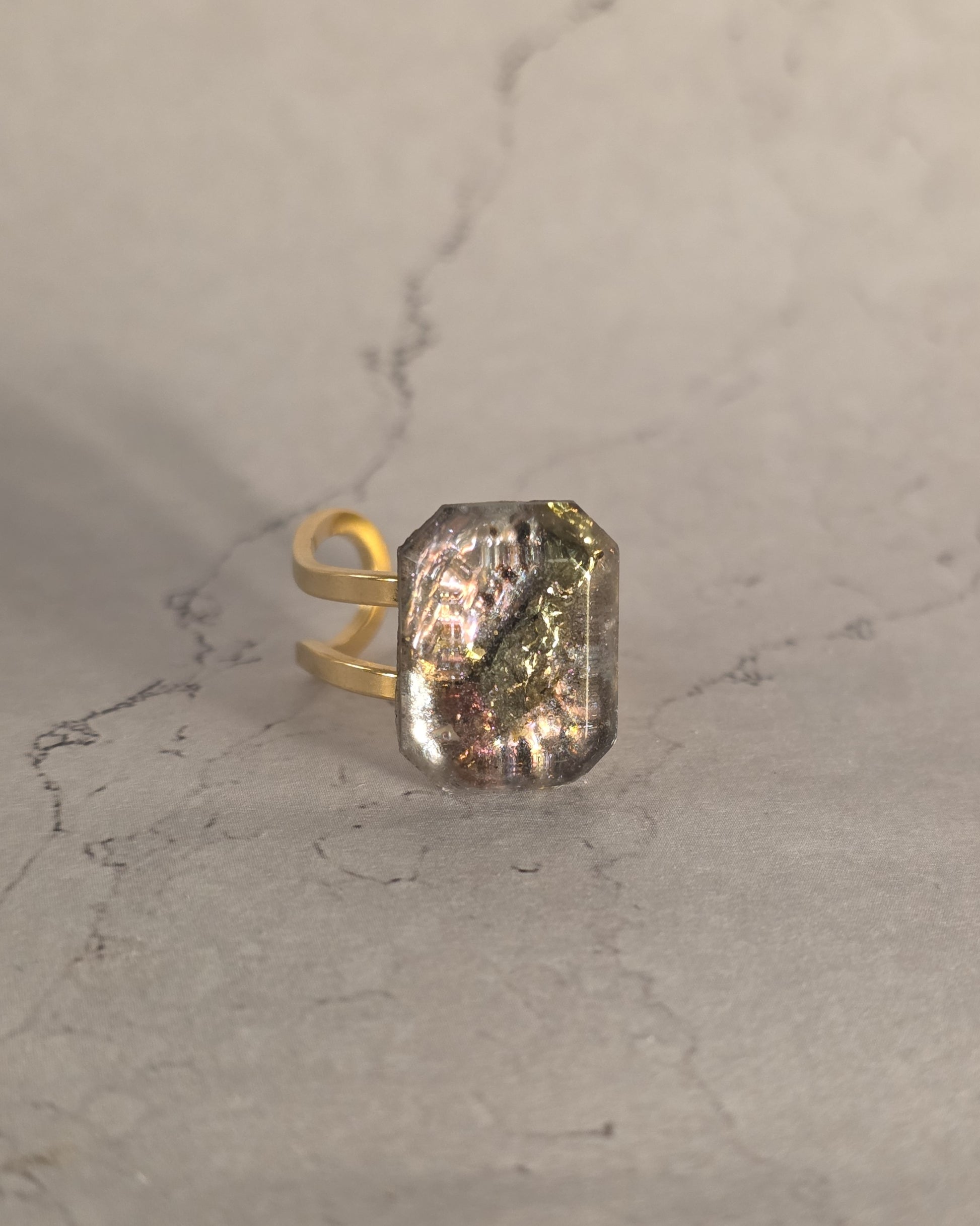 One-of-a-kind handcrafted resin charm on gold-plated stainless steel adjustable band. Each ring is individually handmade, ensuring no two are exactly alike. Lightweight, durable, and versatile, perfect for layering or wearing solo.