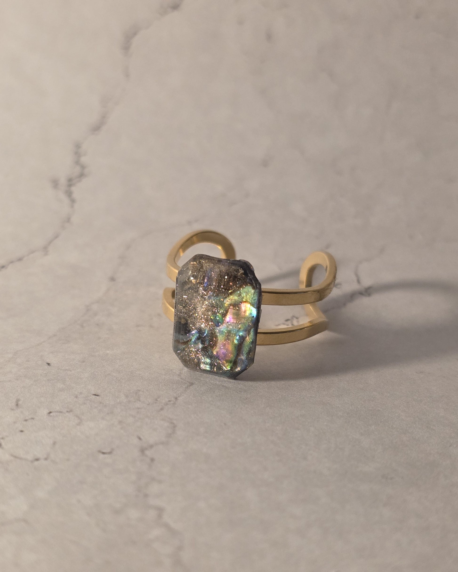 One-of-a-kind handcrafted resin cabochon on gold-plated stainless steel adjustable band. Each ring is individually handmade, ensuring no two are exactly alike. Lightweight, durable, and versatile, perfect for layering or wearing solo.