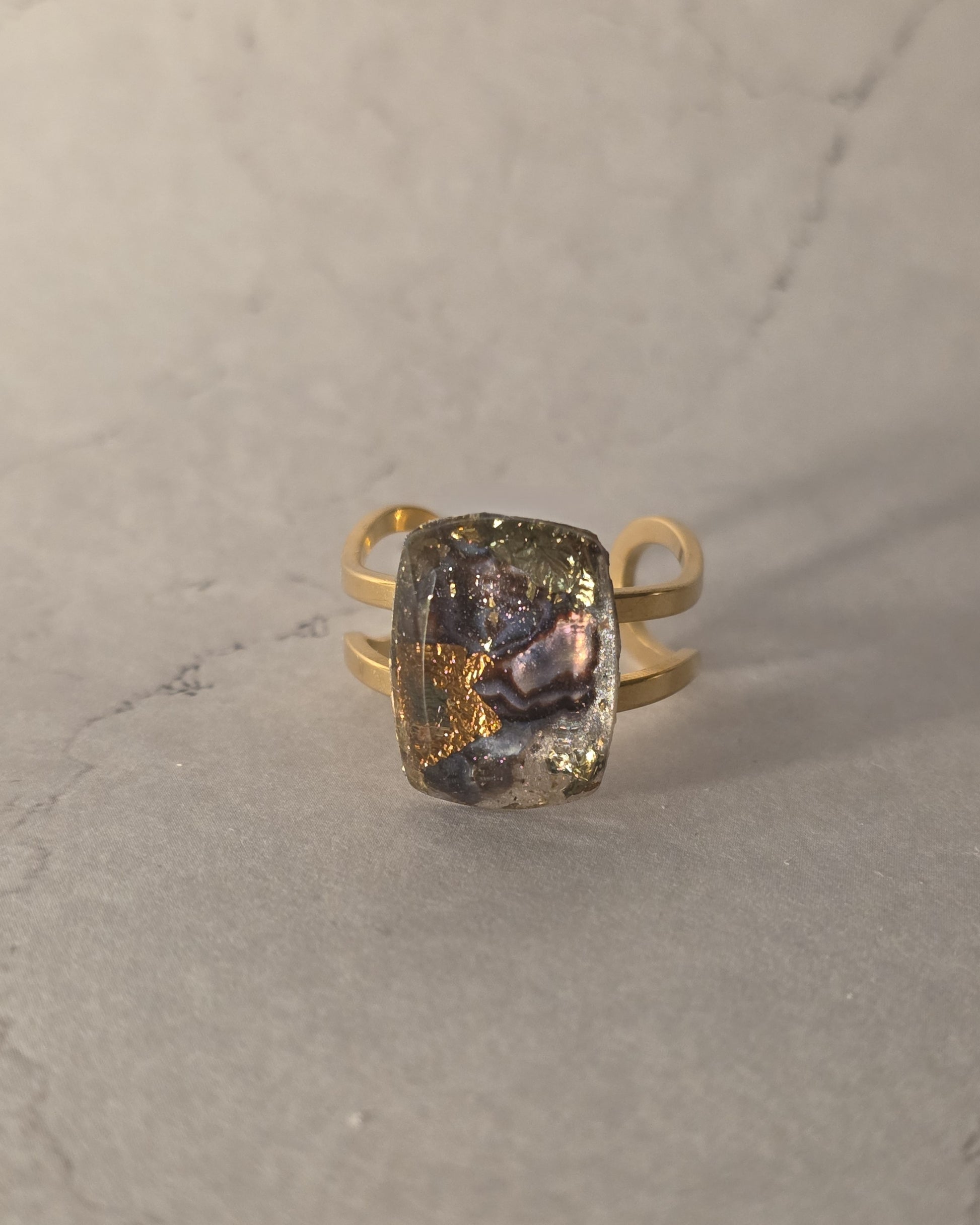 One-of-a-kind handcrafted resin cabochon on gold-plated stainless steel adjustable band. Each ring is individually handmade, ensuring no two are exactly alike. Lightweight, durable, and versatile, perfect for layering or wearing solo.