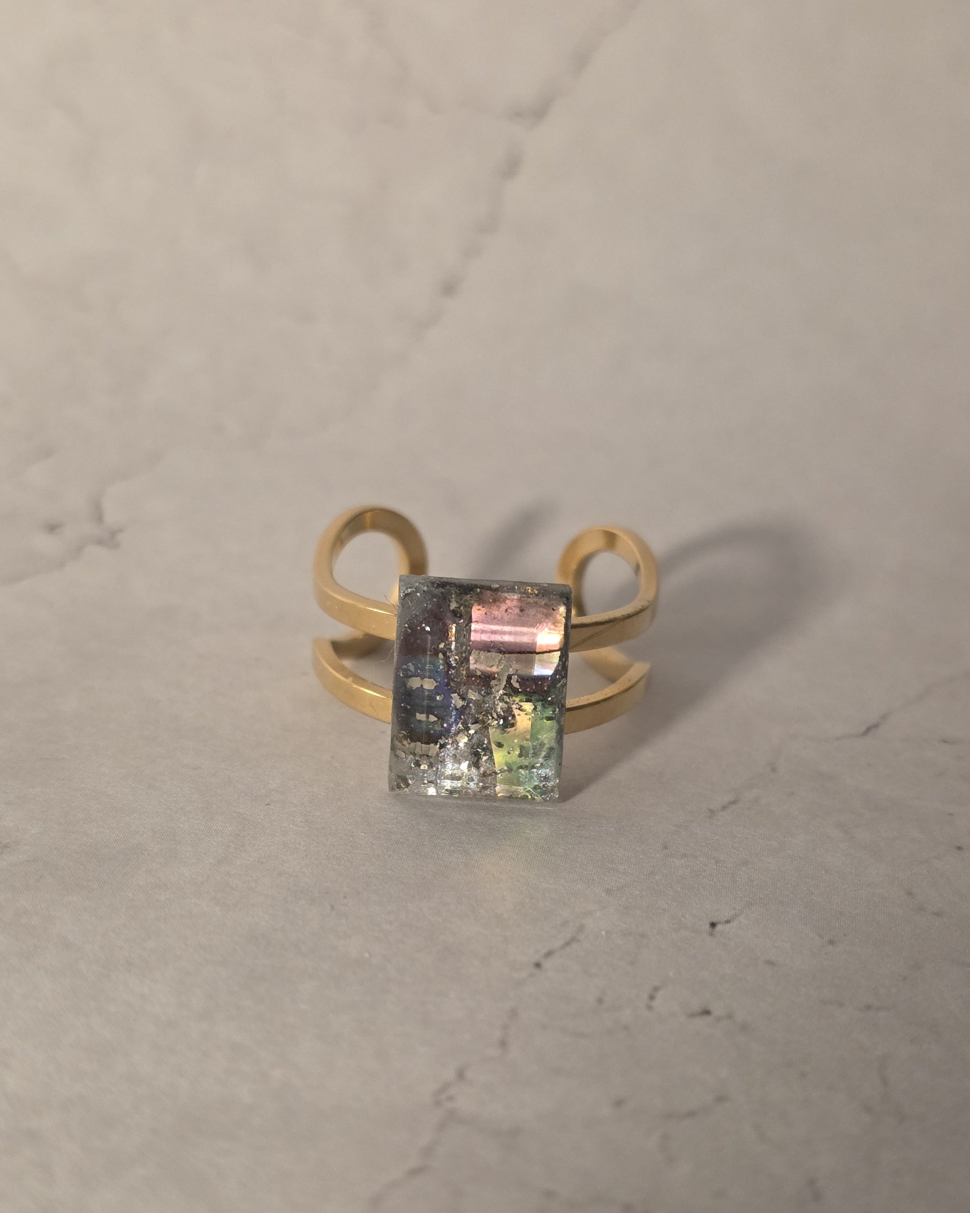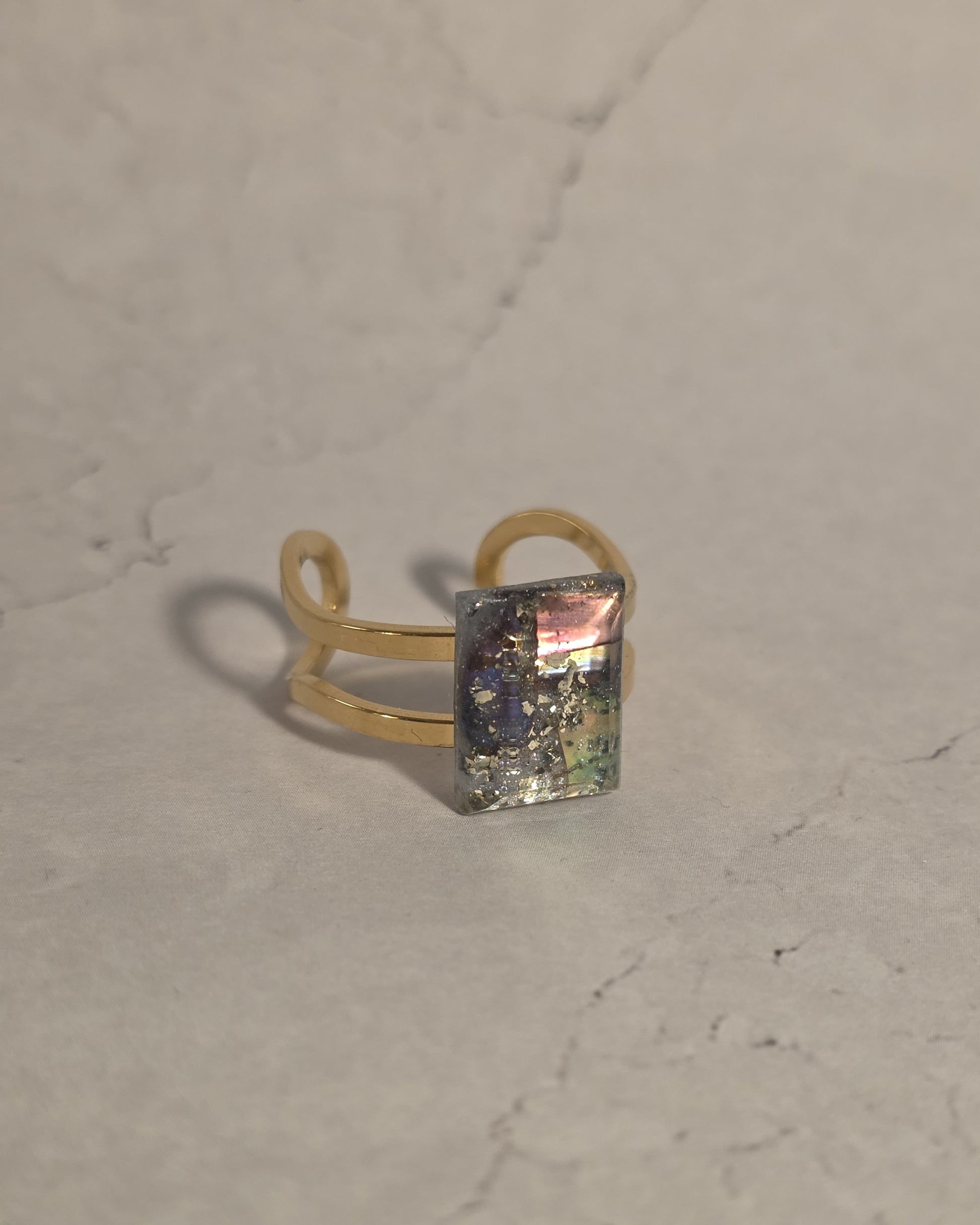 One-of-a-kind handcrafted resin cabochon on gold-plated stainless steel adjustable band. Each ring is individually handmade, ensuring no two are exactly alike. Lightweight, durable, and versatile, perfect for layering or wearing solo.