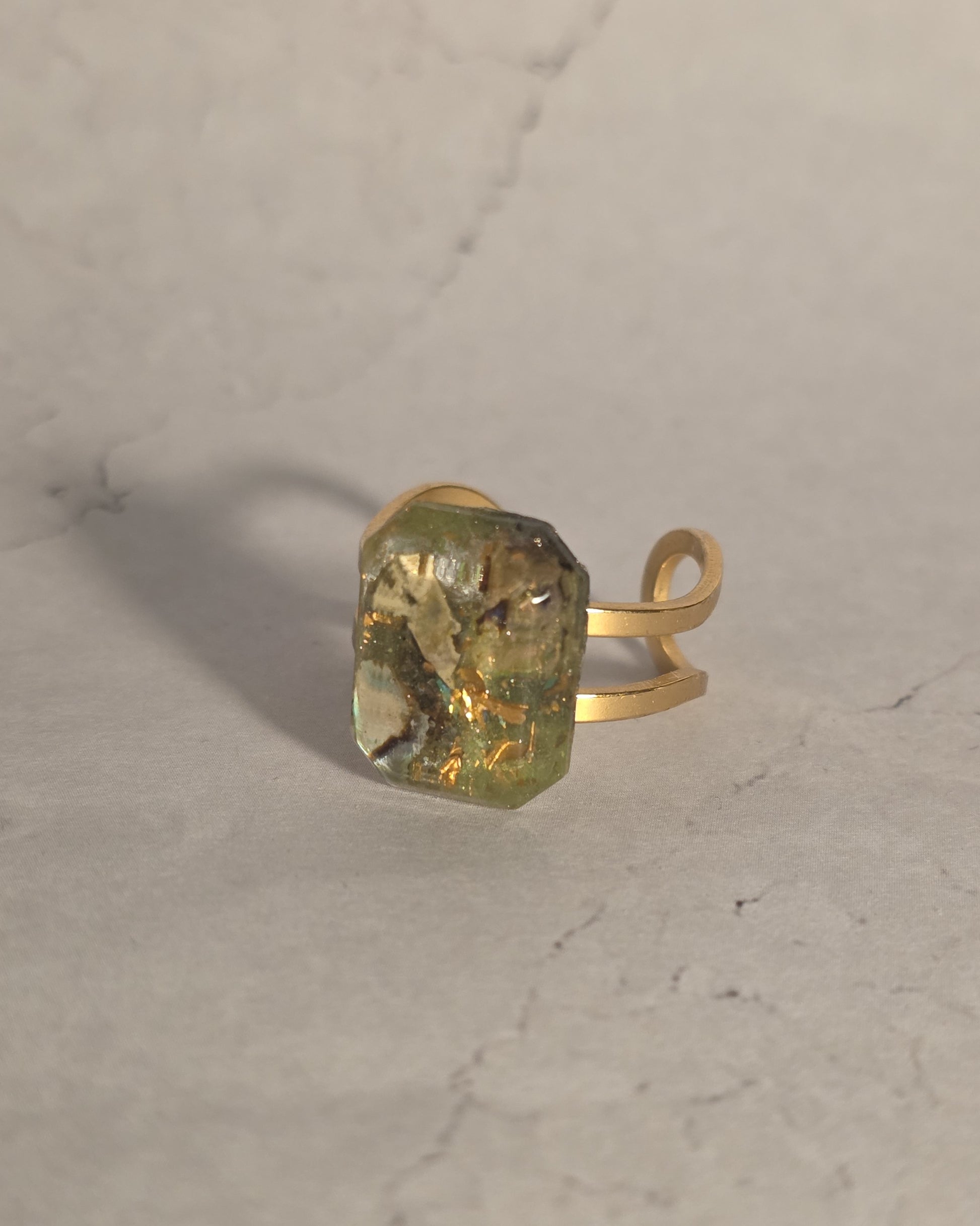 One-of-a-kind handcrafted resin cabochon on gold-plated stainless steel adjustable band. Each ring is individually handmade, ensuring no two are exactly alike. Lightweight, durable, and versatile, perfect for layering or wearing solo.