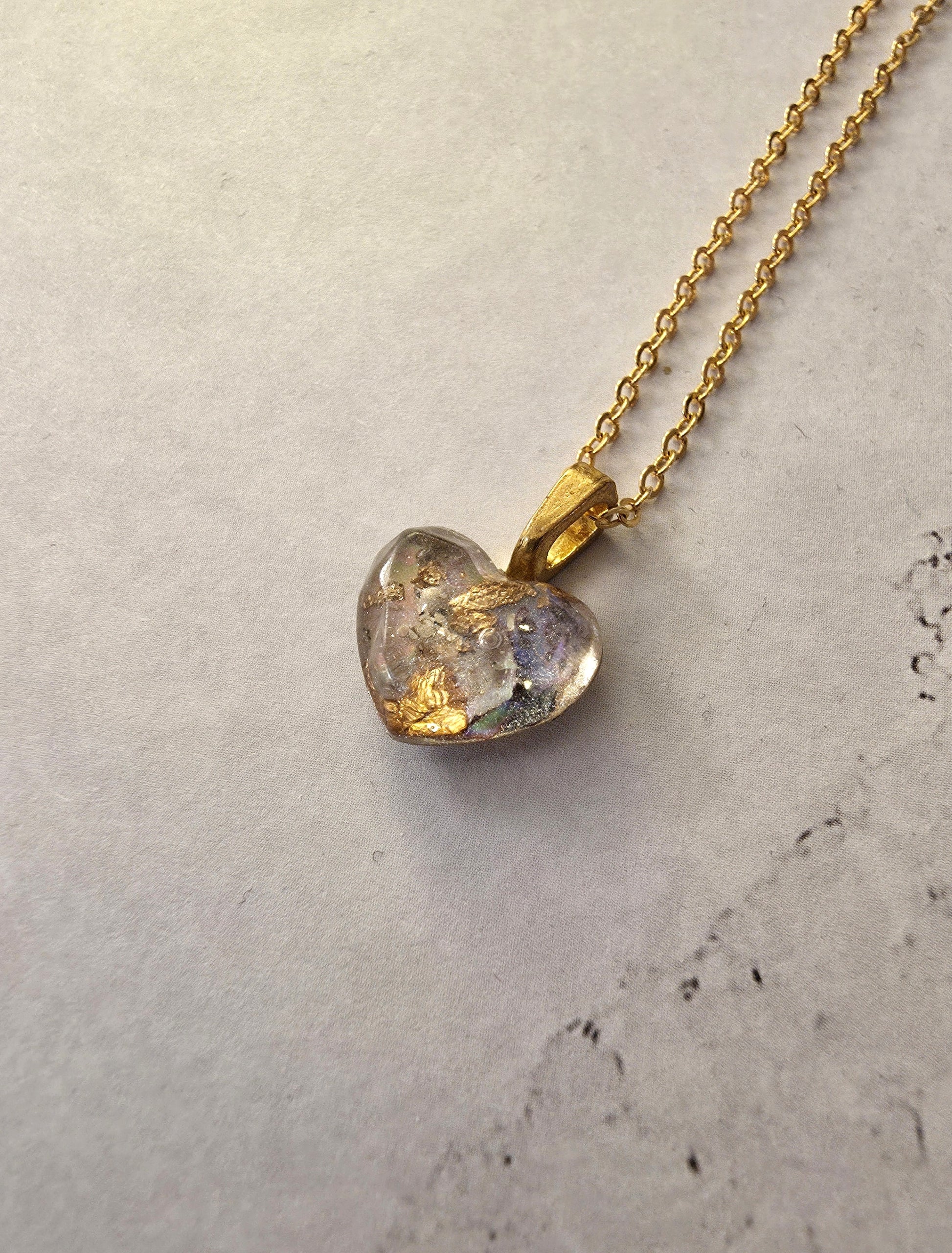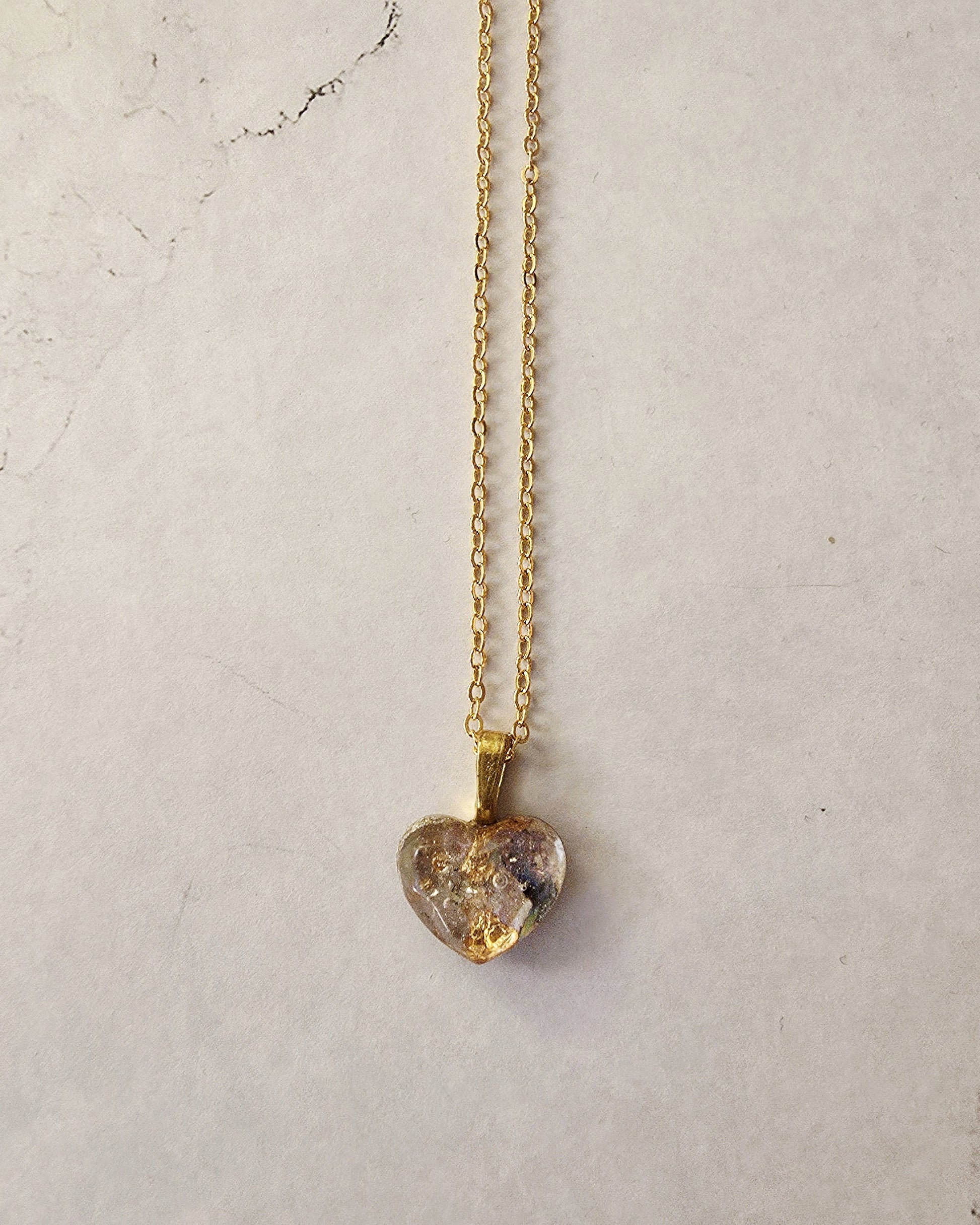 Individually handcrafted small resin heart charm on 24k gold plated 16" chain. Lightweight and comfortable for everyday wear.