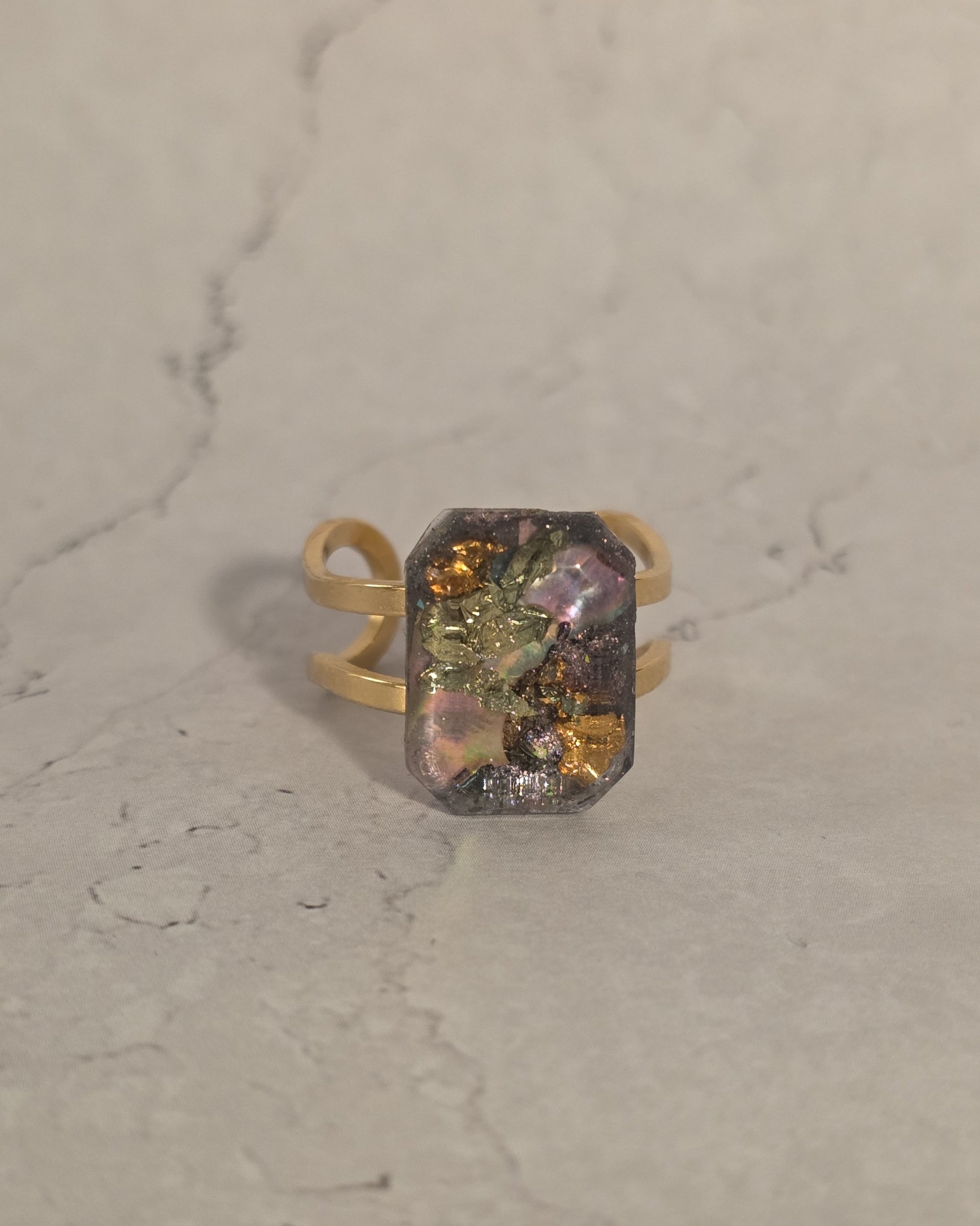 One-of-a-kind handcrafted resin cabochon on gold-plated stainless steel adjustable band. Each ring is individually handmade, ensuring no two are exactly alike. Lightweight, durable, and versatile, perfect for layering or wearing solo.