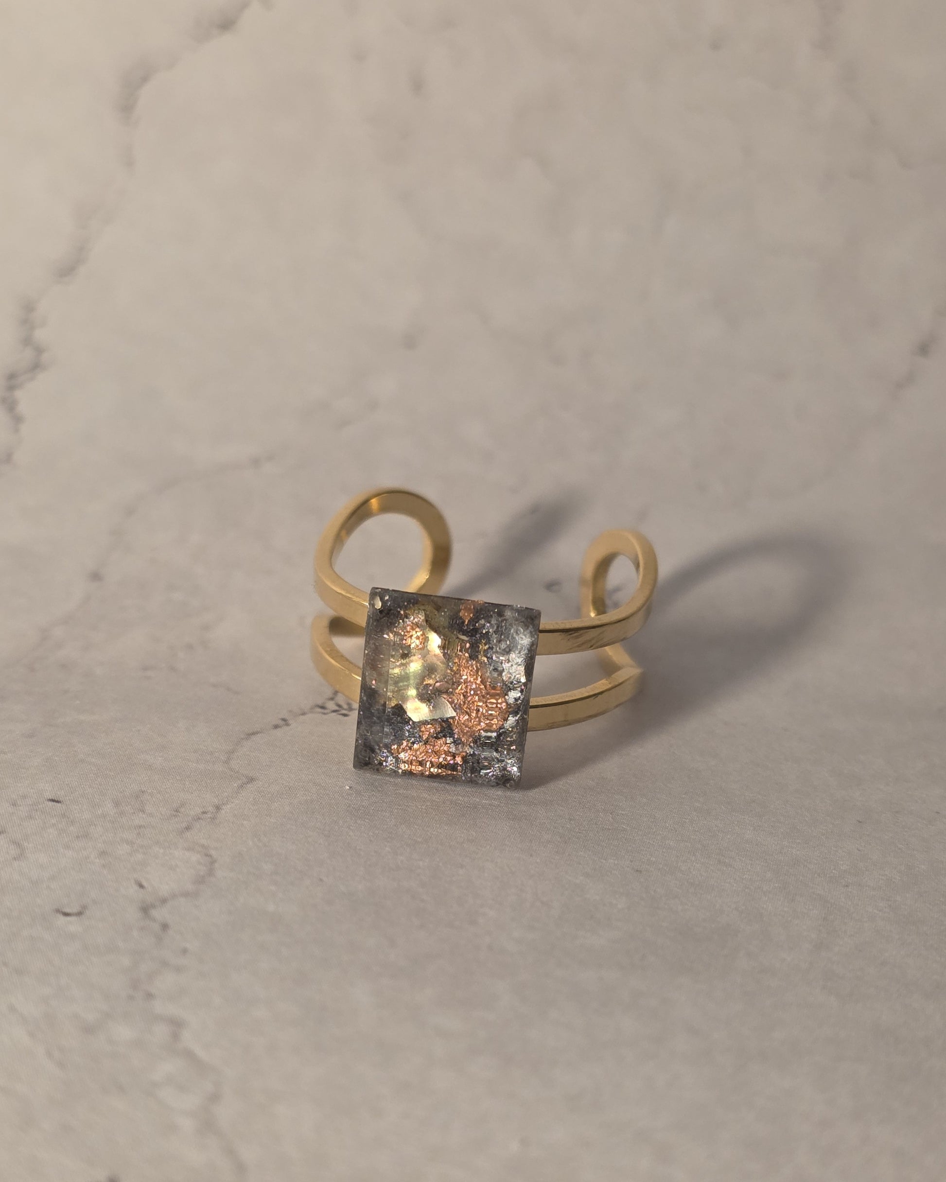 One-of-a-kind handcrafted resin cabochon on gold-plated stainless steel adjustable band. Each ring is individually handmade, ensuring no two are exactly alike. Lightweight, durable, and versatile, perfect for layering or wearing solo.